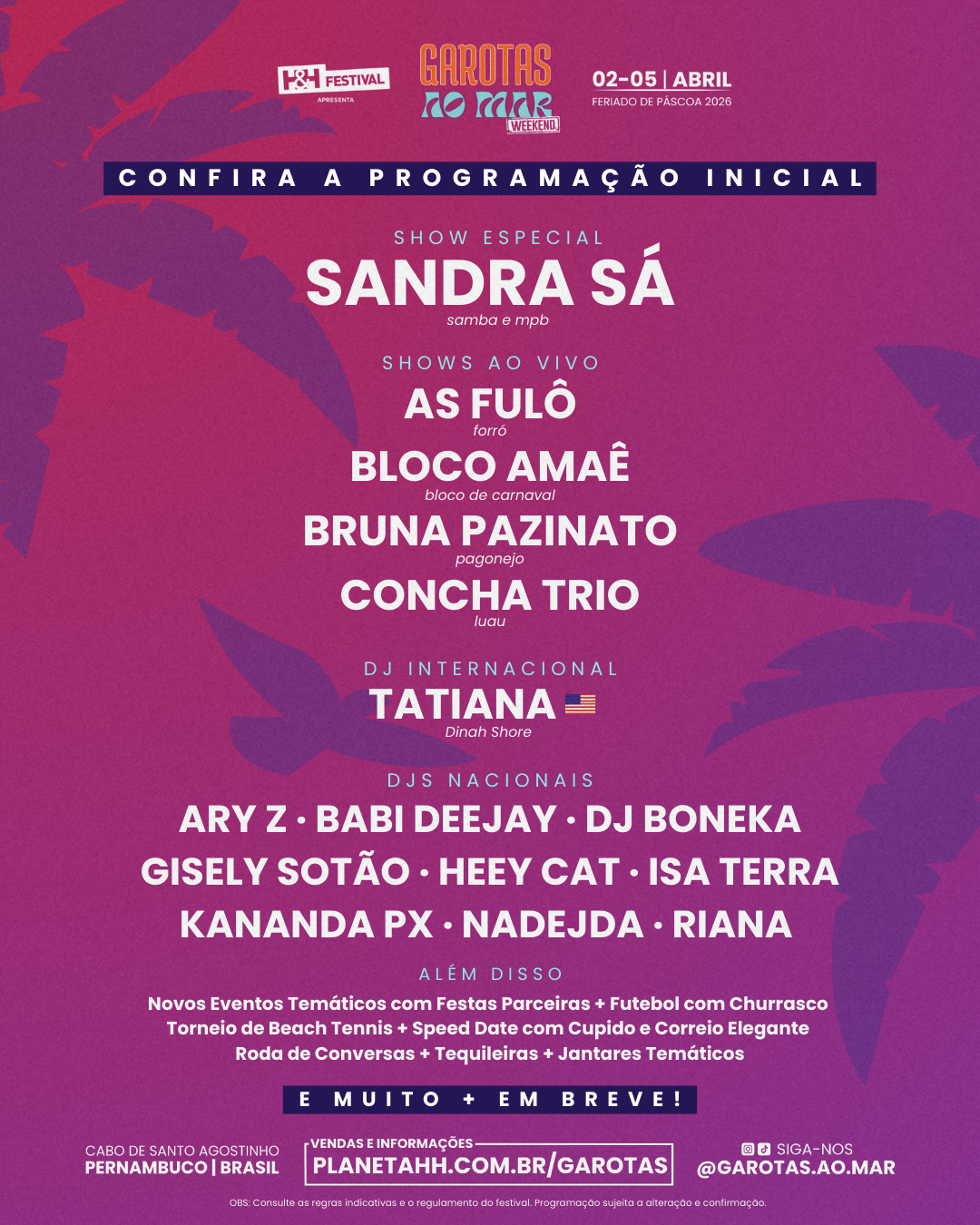 Não perca o próximo Festival Weekend para MULHERES: suas férias perfeitas, com segurança e liberdade. Save the new date: 02 a 05 de abril de 2026, voltaremos novamente ao Nordeste durante o feriado de Páscoa no maravilhoso resort Vila Galé Cabo de Santo Agostinho em Pernambuco, à beira-mar.